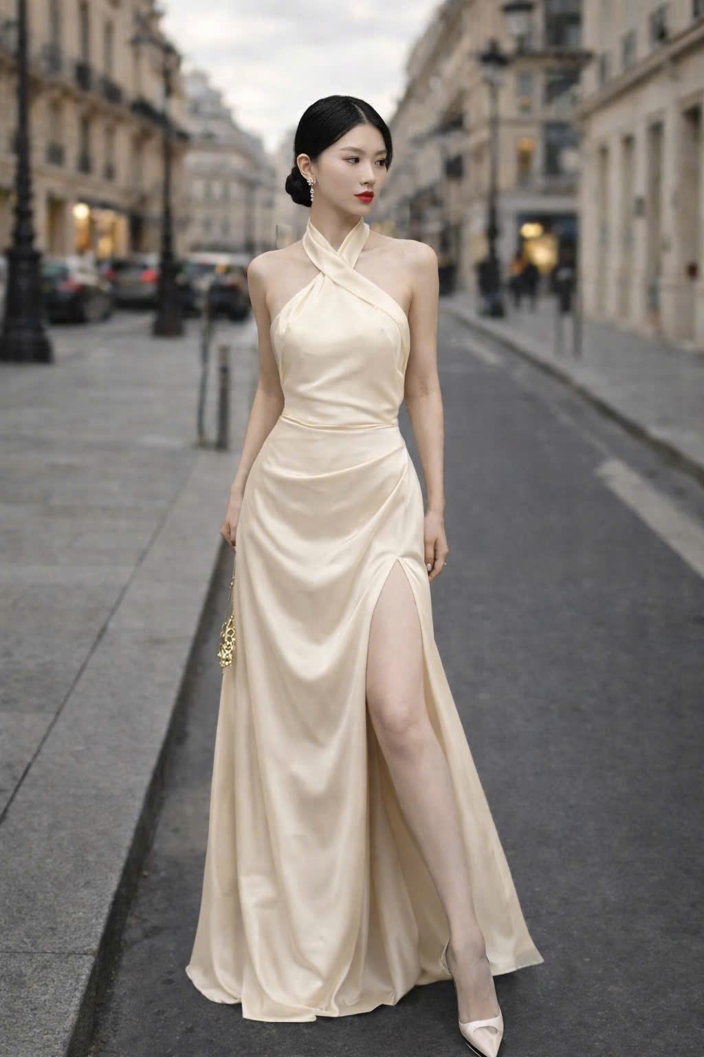 Độ dài: Maxi quét sàn (Floor-length) hoặc Midi xẻ tà.